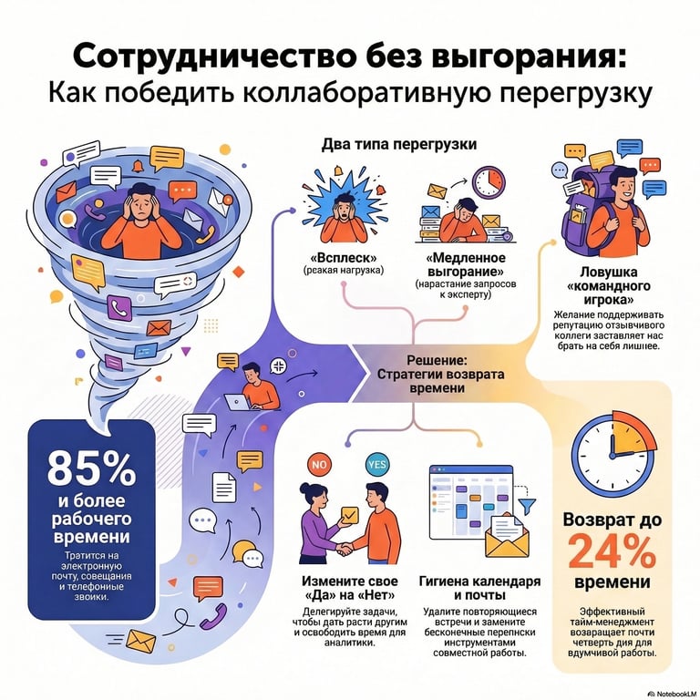 Исследования Роба Кросса и его коллег показывают шокирующую статистику: современные менеджеры тратят более 85% рабочего времени на совещания, почту и звонки. На глубокую аналитику, принятие стратегических решений и просто на то, чтобы побыть с семьей, остается меньше 15%. Это и есть «коллаборативная перегрузка».