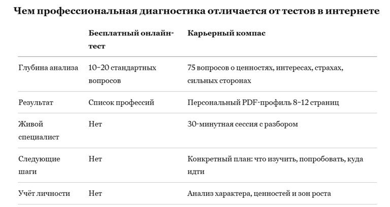 «Карьерный компас» устроен иначе. Это не тест — это профессиональная диагностика с живым специалистом, которая даёт конкретный план, а не просто список слов.